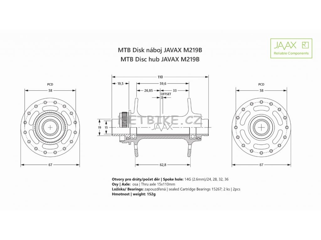 Kvalitní přední BOOST náboj Javax M219B na Center Lock kotouče, odlehčená levá i pravá příruba, zapouzdřená průmyslová ložiska.